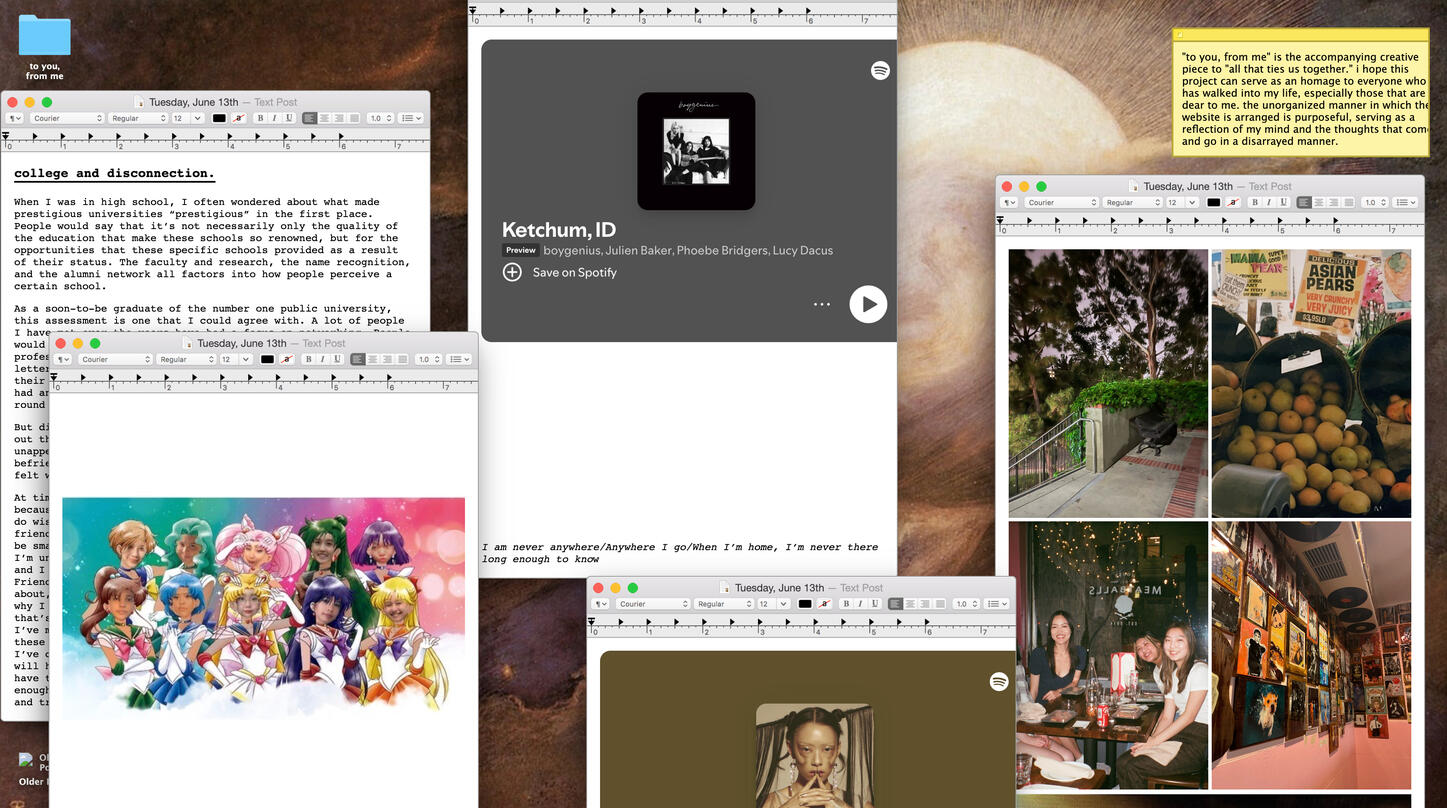 When I'm not working on anything, you can find me writing Letterboxd reviews, documenting my travels with film photography, or curled up with a book!